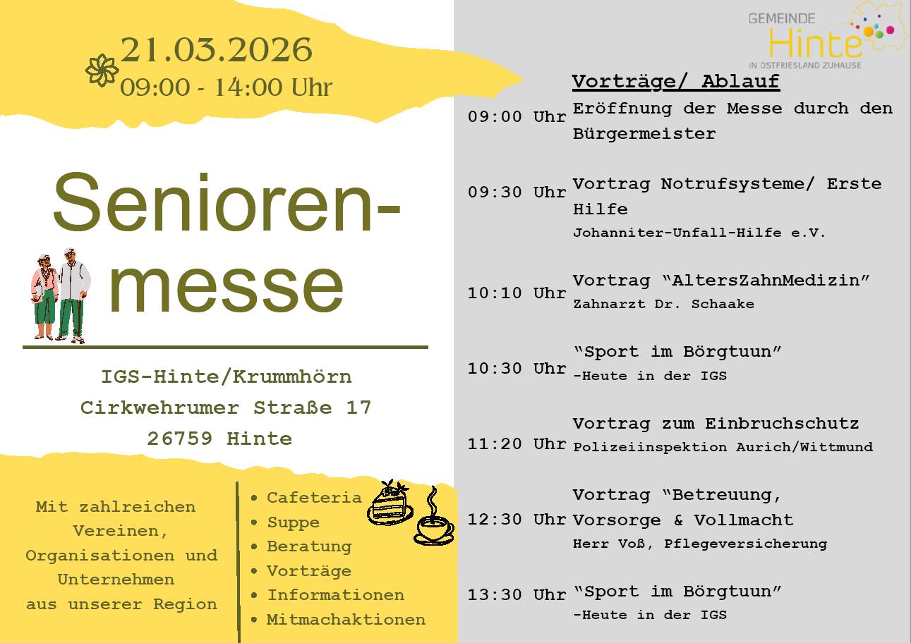 Hinte. Wie gelingt ein gutes, sicheres und gesundes Leben im Alter? Antworten darauf gibt die 2. Seniorenmesse der Gemeinde Hinte. Am Samstag, 21. März 2026, sind Seniorinnen und Senioren, Angehörige sowie alle Interessierten von 9:00 bis 14:00 Uhr in die IGS Hinte/Krummhörn eingeladen. Nach der erfolgreichen Premiere im Jahr 2024 wird auch diesmal ein breites Programm geboten, das praktische Informationen mit persönlichen Gesprächen und Angeboten zum Mitmachen verbindet.